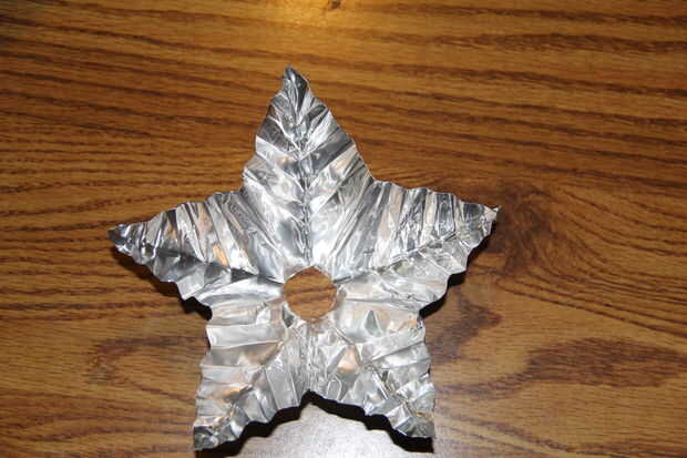 La estrella puede ser una luz desnuda, un molde de tarta redondo pequeño o una estrella hecha en casa. Para este Instructable, una estrella de 5 puntos 3D está hecha de aluminio grueso cortado de la parte inferior de una lata grande de "pie" asado. Hay muchos videos sobre cómo a haga el 3D estrellas, pero el video de YouTube "punto 5 estrellas con un cuadrado de papel" es particularmente útil. A partir de un 7.5 en cuadrados de papel de aluminio parece ser el tamaño óptimo. Cada uno de los cinco puntos de la estrella están amontonados encima de para crear "volantes" para mejor reflexión de la luz. Por último, orificio de 1 pulgada en el centro de la parte inferior para la inserción en el árbol como las bandejitas. Tenga en cuenta que tijeras será útiles para el corte de la lámina gruesa. La foto de arriba muestra la estrella 3D de papel rizado final.