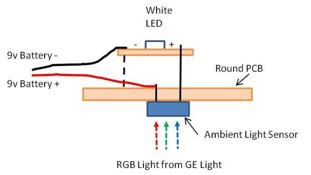 Piezas para hack "GE luz ladrón" son 5 mm Sensor de luz ambiental, cable de la batería de 9v, kit PCB redondo de Radio Shack, y el LED es un LilyPad blanco LED de SparkFun.com. Cinta doble palo se utiliza para adherir a la Asamblea sobre la lente de plástico dentro de la luz. Un simple diagrama se indica arriba.