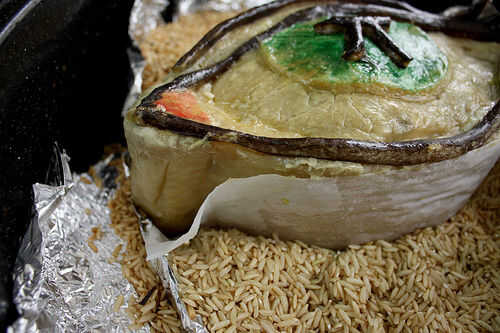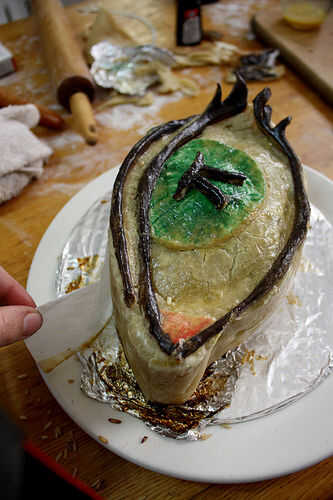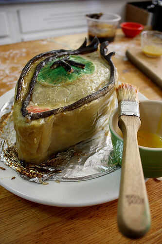 Coloque el pastel en horno y hornear durante 30 minutos. Después de 30 minutos, remueva y cepille la parte superior del ojo con el huevo. Cocer al horno durante otros 20 minutos.