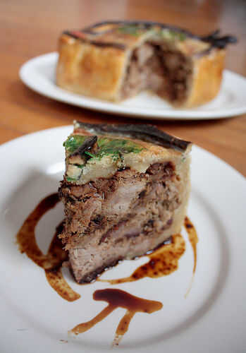 un clásico pastel de carne de cerdo inglés tiene una masa quebrada de agua caliente formado de mano, un relleno de carne de cerdo picada o en trozos pequeños, carne sazonada sólo con sal y pimienta y rematada por con jalea, añadido después de la cocc