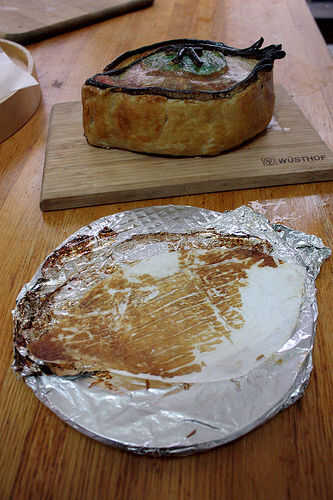 Retire del horno y dejar para reposar 15-20 minutos.  Retire el pan base y pergamino inferior de resorte forma.  Servir tibio.  Decorar con sidra rociado au jus. Disfrutar el pastel glorioso ojo por un tiempo, pero no demasiado.  Comer antes que se enfríe!