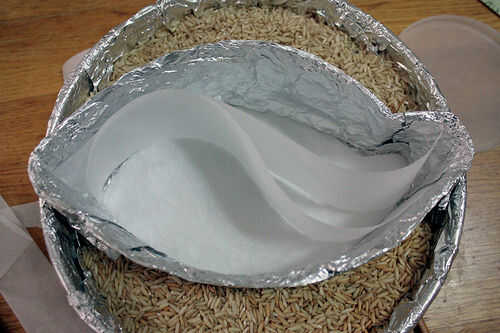 Una vez que tenemos las paredes del molde de ojo hechas, podemos montar el molde. Comience envolviendo la base circular y las paredes con papel de aluminio. Envolver cada uno individualmente. Lugar muelle forma base en las paredes de la cacerola y forma del resorte clip base en su lugar. Coloque las paredes del molde de aluminio en el centro de la cacerola. Rellenar los bordes entre el molde y las paredes de la cacerola con unas tazas de arroz. El arroz dará estabilidad a la tarta hornea.