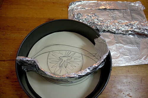 Coloque una hoja de pergamino sobre su original diseño de ojos y contorno fuera del ojo. Corte y coloque en el fondo del molde papel de aluminio. Cortar hojas de pergamino y la línea de las paredes. El pergamino mantendrá el pastel se pegue a alguno de lo de aluminio.