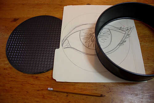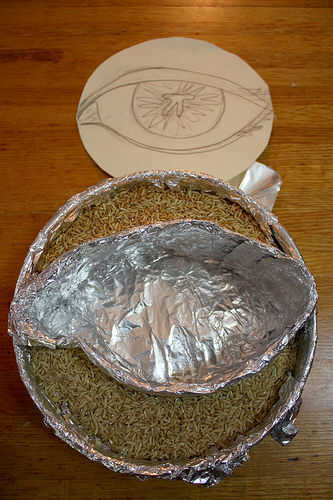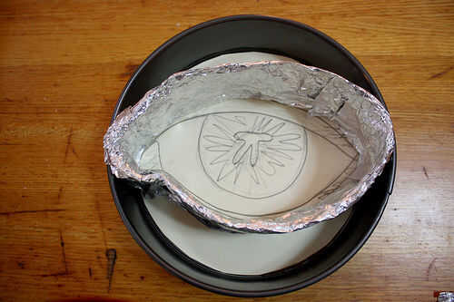 Ahora es el momento para hacer las paredes de nuestro molde de ojo. Coloque el ojo dibujo en la base de su bandeja de forma primavera. Doblar hojas de papel de aluminio y utilizando a su guía de la vista, coloque el aluminio alrededor de los bordes del ojo. Doblar la hoja hasta que tenga un ojo en forma del molde.