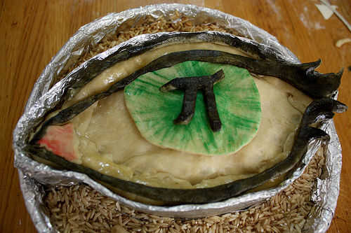 Cortan la plantilla original de ojo en las piezas, pestañas, desgarro de conducto, iris, pupila, etc... Estirar trozos de masa restante y cortar partes de ojo. Ya que esta es una celebración de día de Pi, vamos a hacer a la pupila en forma de Pi! Cómo inteligentes.