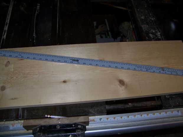 Dos piezas 36 pulgadas de largo se arrancaron a la anchura de la base y la pieza frontal, aprox. 10 3/4 pulgadas A marca fue hecho 4 pulgadas desde la parte inferior a lo largo de la parte delantera y 4 pulgadas de la parte posterior a lo largo de la parte superior, las dos marcas fueron conectadas con una línea y hacer un corte a lo largo de esa línea. No hay buenas fotos, pero es bastante claro en la foto montada.