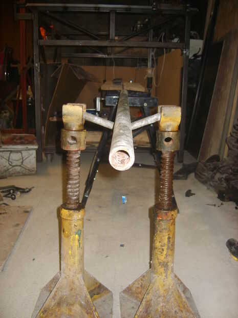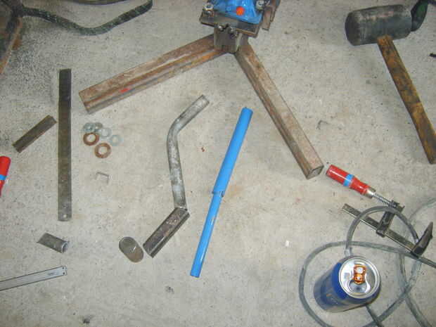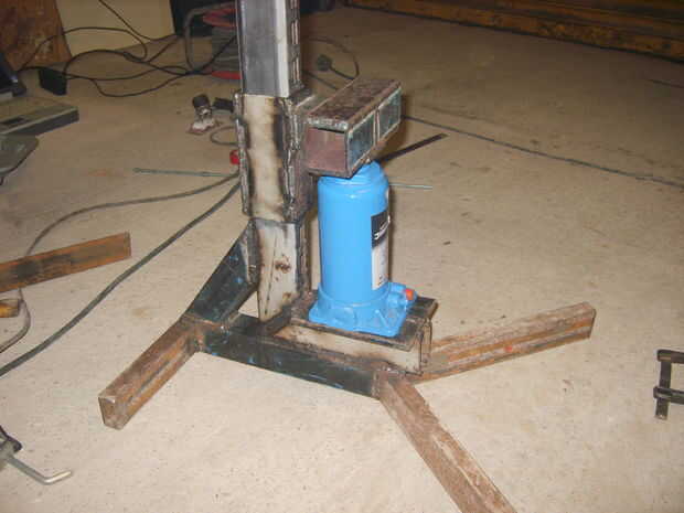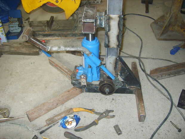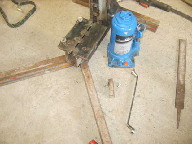El gato es un gato de 10 Ton Silverline, comprado en Amazon por menos de 20 libras de GB. Que es un chollo!!!. Para habilitar el conector a utilizar para otra cosa, me aseguré que se puede quitar. El pedal debe ser guiado como lo contrario se tambalea hacia un lado. He añadido un bungee para devolver automáticamente el pedal en la posición superior. Para guiar el bungee, utilicé a un viejo tensor de correa de tiempo de un MK1 Volkswagen Golf (= VW Rabbit en Estados Unidos...). La curva en el pedal fue alcanzada por otros un tubo con un martillo grande.