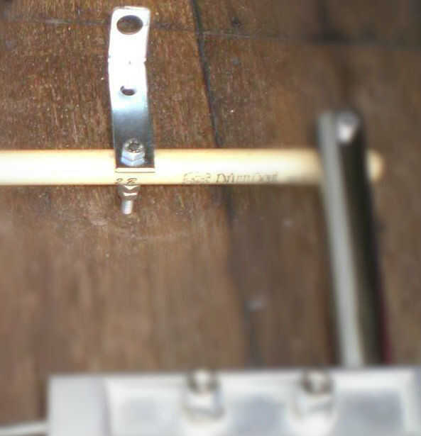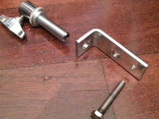 En el extremo superior del taladro un agujero con el diámetro del embrague (yo usé el agujero en el centro, 20mm). Mida la holgura al hacerlo - desea el agujero cerca de la palanca para reducir fuerzas angulares, pero el embrague tiene que limpiar el extremo del perno de 6 mm abajo, y la tuerca de embrague hi-hat debe limpiar el soporte.