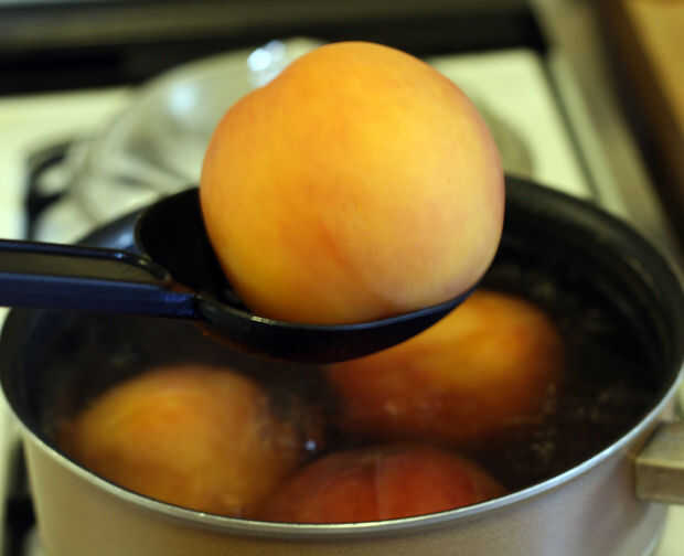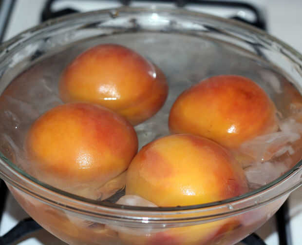 Retirar los duraznos con una espumadera y sumergirla inmediatamente en agua con hielo.
