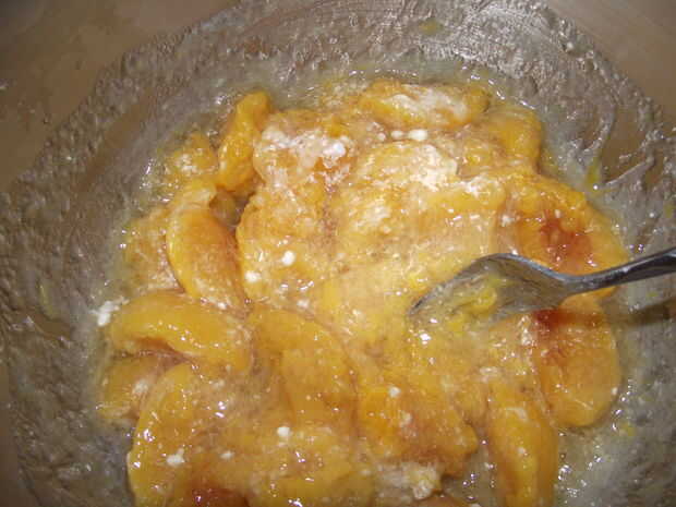 Descarga su fruta en un tazón, si es realmente liquidez que tienes que volcar la mitad del líquido. Agregue sobre una 1/4 taza de azúcar y unas cucharadas de harina y esto espesará mientras se cocina. Luego volcar la mezcla en tu tarta (me olvidé de tomar una foto de este paso pero te imaginas)