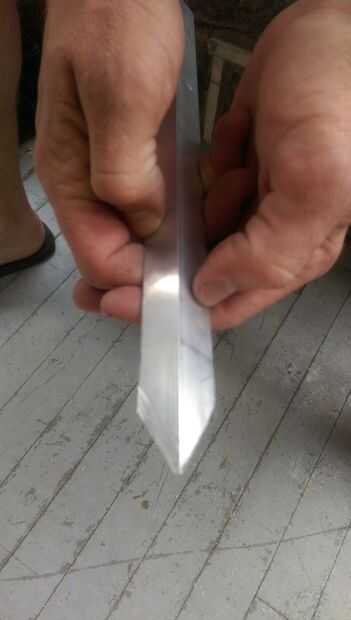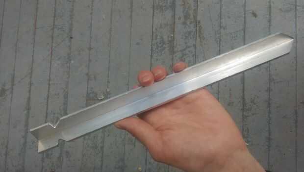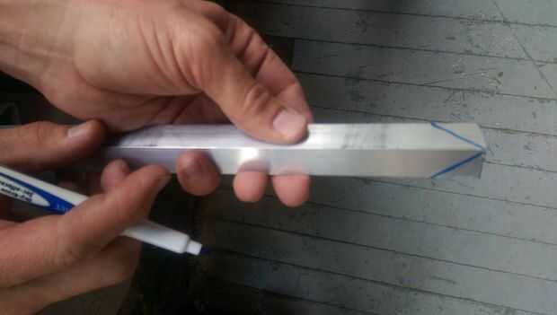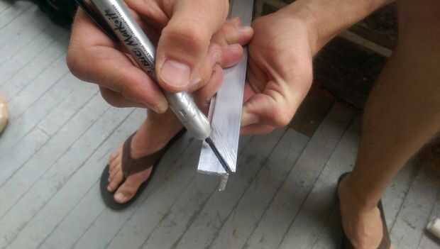 2. en un extremo de cada sección de aluminio, marca una línea desde el centro del ángulo hacia el borde, creando un ángulo de 45°; Repita al otro lado del centro para crear un punto. Corte a lo largo de las líneas de guía.