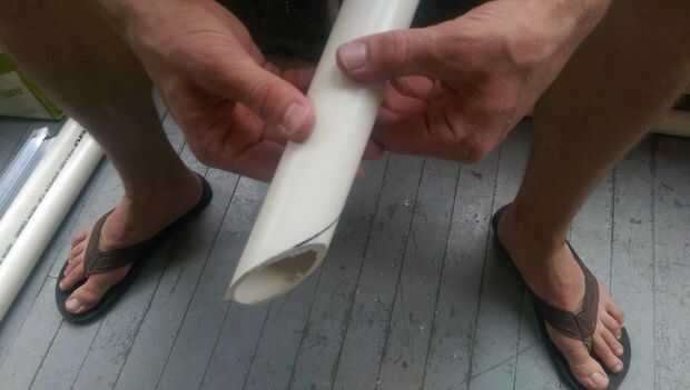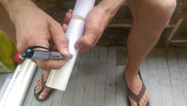 4. Envuelva el papel doblado recientemente la guía alrededor de una sección de 1 "PVC ¼ pipa – Asegúrese de que una de las esquinas de la guía de papel termina en el borde de la pipa, y alinea el borde inferior de la guía de todo el camino alrededor.