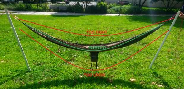 8. plenamente montar el segundo post de apoyo y conecte el otro extremo de la hamaca al lazo en la parte superior de la misma. Coloque el soporte para segundo post para que también está en un ángulo de 80° de la tierra, y hamaca tiene una generosa curva en la parte inferior pero todavía aproximadamente un pie del suelo. En la parte inferior de este post debe ser martillada la marca.