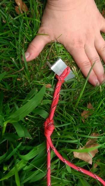 7. tirar cables de apoyo hasta el recto, pero no apretado. Juego de martillo en la tierra en un ángulo agudo del puesto de apoyo. Repita con la segunda cuerda y juego.