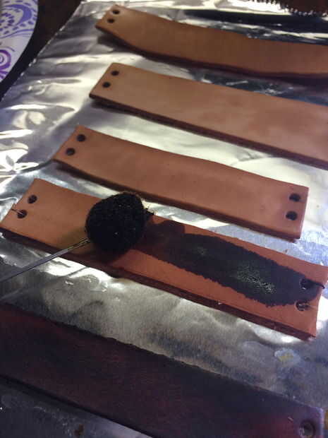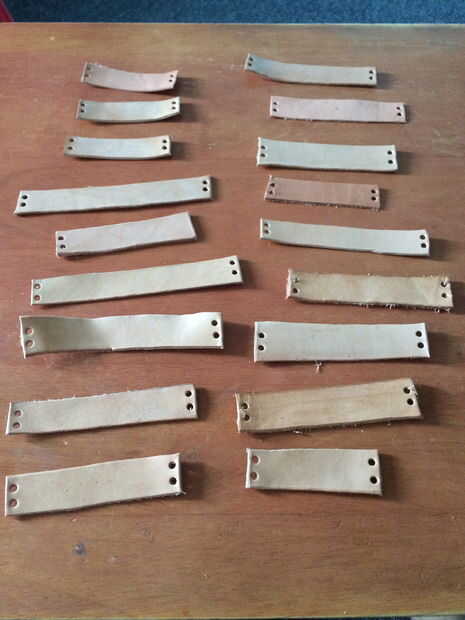 1. corte 3/4"- 1" ancho tiras de cuero de diferentes longitudes y perfora 2 orificios hacia fuera en cada lado.