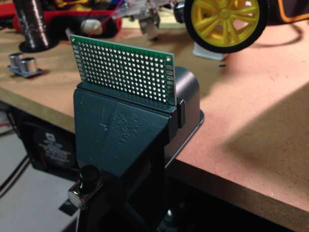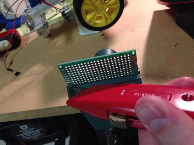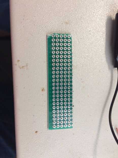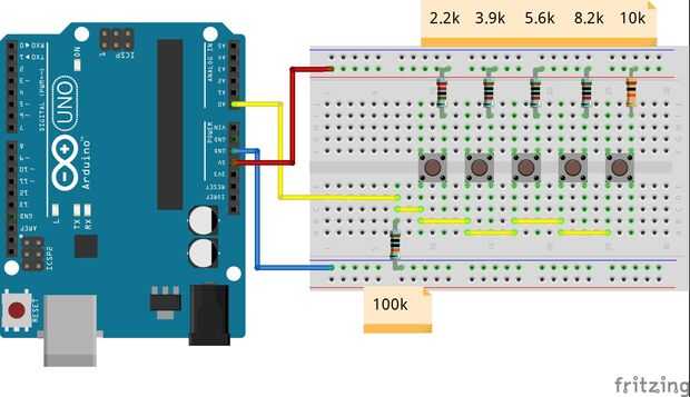 Cortar un trozo de tablero no tira PCB para el tamaño y la forma necesaria y luego coloque los botones de tal forma que alinee con los agujeros. Luego añadimos resistencias de diferente valor con el fin de crear una serie de divisores del voltaje que será leído por el pin analógico solitario que estamos utilizando. Adjunto un diagrama de Fritzing que muestra el concepto ya que no consigo una buena foto de mi cableado final. Usted puede también ver el instructable vinculados a continuación si necesita ayuda para conceptualizar lo que estamos haciendo aquí.