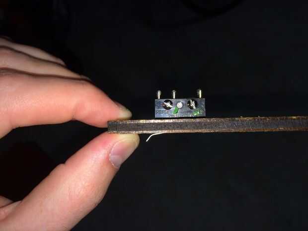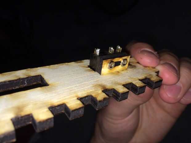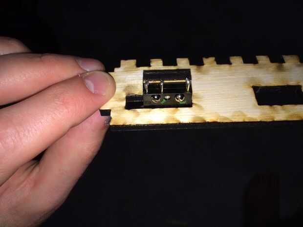 Primero vaya la cabeza y pegue o atornille en su lugar. La T forma/ranurado trocito que corte en el cortador del laser es el soporte de a que esto adjuntará. Puede que necesite modificar esta pieza en su diseño y no tengo un número de parte para darle a esta carrera. Pegue el soporte en forma de T en la ranura en la parte inferior de la caja, dejar secar 30 minutos. Luego pegue o atornille el tope en su lugar. Doblar el brazo del interruptor de nivel cuidadosamente tal que sobresalga lo suficiente como para activar cuando se establece en una superficie plana.