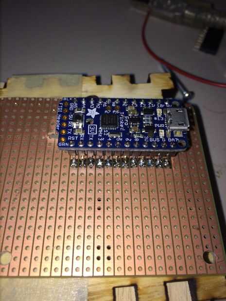 A continuación, la soldadura en los pernos de encabezado en el Pro - abalorio y luego la baratija Pro a la PCB. He elegido para que los rastros hacia el exterior de la caja (solo lado PCB) tenemos la cabecera lleva palo de pins a través de tan poco como sea posible para ayudar a eliminar cortocircuitos contra el LED debajo.