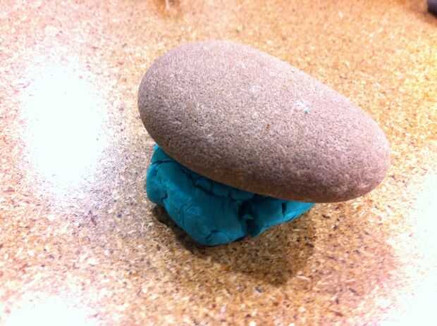 -Hacer una bola de plastilina y empujar su piedra en la parte superior de la arcilla, con la superficie para ser grabado al agua fuerte hacia arriba. Ajustar la piedra por el ojo (o con un nivel de burbuja pequeña) para asegurarse de que la superficie etchable es como horizontal plana como sea posible.