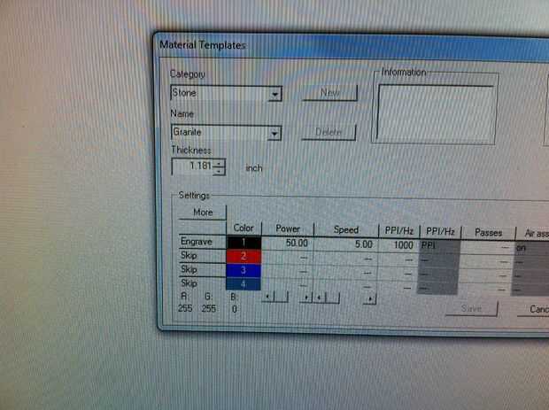 -Configurar el láser de potencia y velocidad a los niveles correctos para el grabado en piedra. Para mi proyecto, un nivel de potencia de 50 y la velocidad de 5 a 1000 ppp, era buenos para un primer paso.