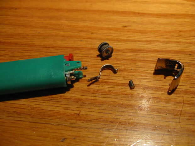 sólo haz funky en él y sacar la rueda de pedernal. un juego de alicates bastará. el resto es torta. sólo asegúrese de que cuando el resorte salta te mantenga las manos alrededor de ella para coger el pedernal que si no se operan a través de la habitación.