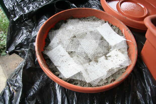 Para fortalecer la piedra angular, cortar la tela metálica de 1/2 pulgada para caber dentro del molde sin tocar los lados. (No tengo ninguna por parte por lo que capas de trozos de cinta de panel de yeso en su lugar.) Centro de la pieza redonda del paño del hardware en el cemento, luego llene la parte superior de hormigón. Para eliminar las burbujas de aire, golpee el molde contra la mesa varias veces, o conjunto de molde en una lavadora funciona. Nivel de la parte superior con el borde de la hoguera, moviéndose en un movimiento de corte de lado a lado mientras se dibuja en la parte superior del molde. Use toallas de papel para absorber el exceso de agua que flota en la parte superior.