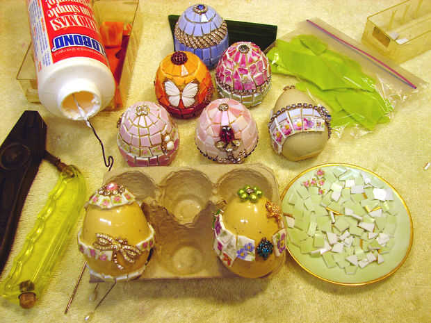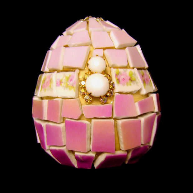 Puse una sección cuadrada de diamantes de imitación de una pulsera vintage en la parte superior del huevo para el drama un poco y agrega brillo. Luego he añadido algunos vintage china rosa pálido para complementar a las petite rosas. Rematado con algunos caliente china rosa que salvó de una fractura en la mano victoriana pintados a tazón de fuente.