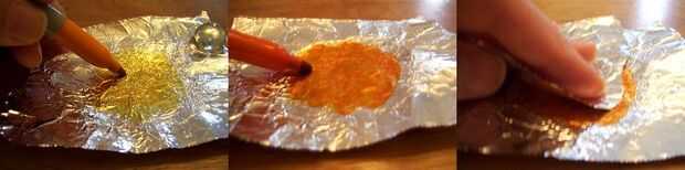 Para más variaciones, dab limpia hoja contra el colorante mientras que es mojado (mezclar colores) o se borra la porción coloreada con el papel para eliminar el pesado color. Otra forma de crear una coloración variada o remolinada es agregar otros colores y patrones en marcador permanente en la parte plana posterior de la piedra de cristal. Cuando se juntan el papel de aluminio y piedra, a combinar ambos efectos para una mirada única. Continuar al siguiente paso una vez que el marcador esté completamente seco en el papel de aluminio y vidrio.