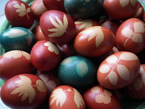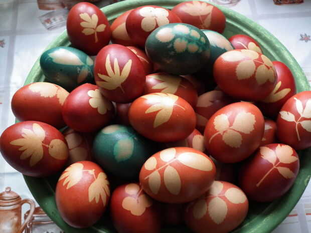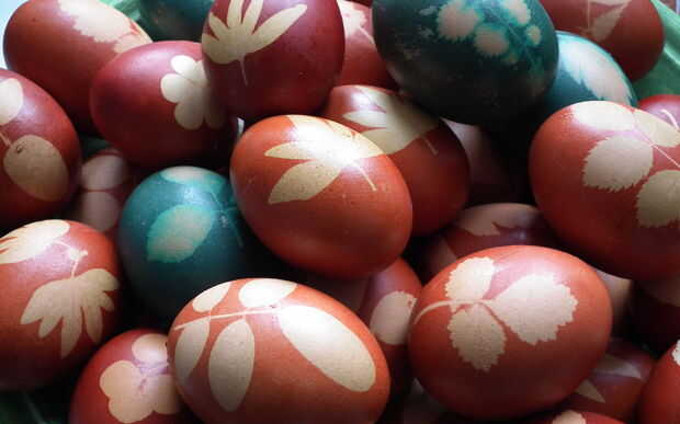 5. tomar un huevo, coloque una hoja sobre el mismo (poner cara, realmente no sé por qué...), Envuelva bien en la media y atar con un hilo.