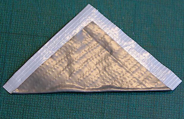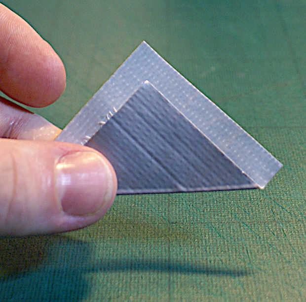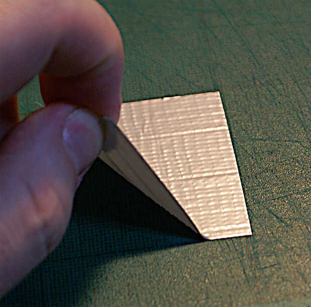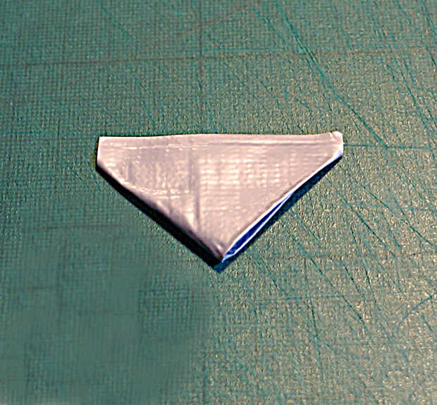 Ahora debe tener una escala triangular con una tira de pegamento a lo largo de un borde, listo para ser pegados a la manga de la cinta, como se muestra en el siguiente paso.