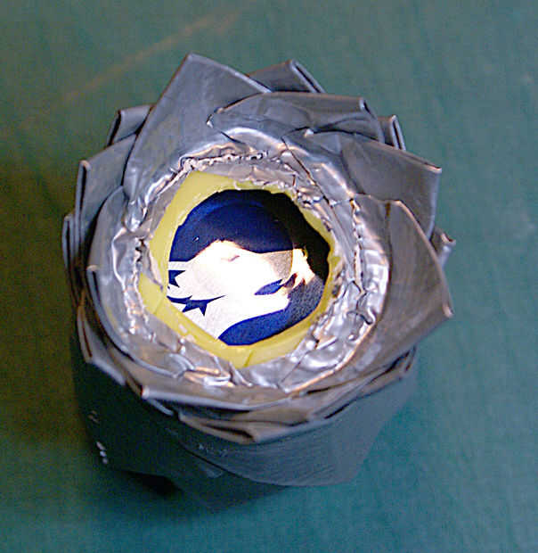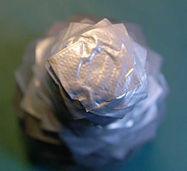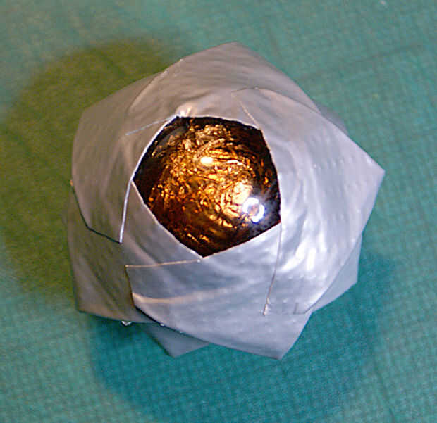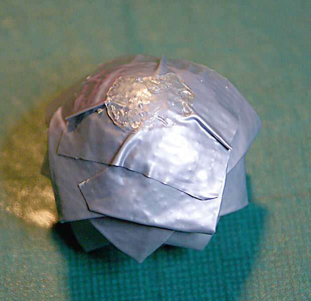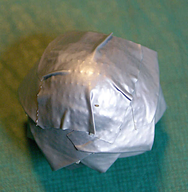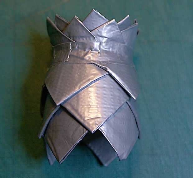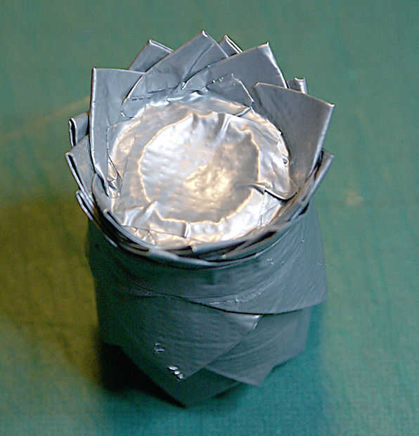 Uso dos casillas de la cinta, el tamaño se utiliza para hacer las pequeñas escamas, colocado a 45 grados entre sí para cubrir el agujero, presione en un hoyuelo con el dedo, esto le da a una superficie para pegar el talón al.