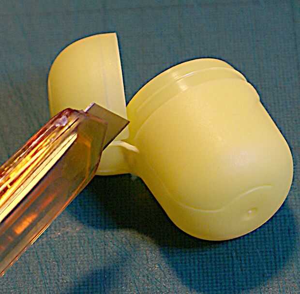 Comience por cortar la bisagra de su cápsula a la mitad, deseche la mitad más pequeña (o guardarlo para futuros proyectos como lo hice) y quitar cualquier resto bisagra de la mitad de grande.