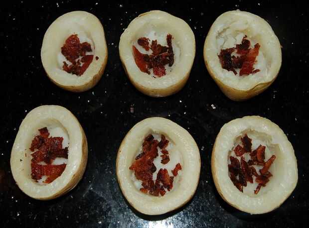 3. Coloque el tocino en la parte inferior de las cáscaras de patata