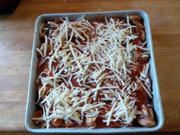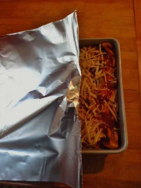 Superior con el resto de la salsa y espolvorear con el resto del queso.  Cubrir con papel aluminio y hornear durante 30 minutos en un horno precalentado 350 grados F.  Retire el papel y hornear por 10-15 minutos hasta que el queso se derrita.