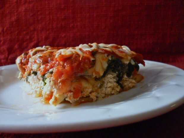 Reposar la lasaña en un posafuentes, ligeramente cubierto por 15 minutos.  Rebanar y servir.