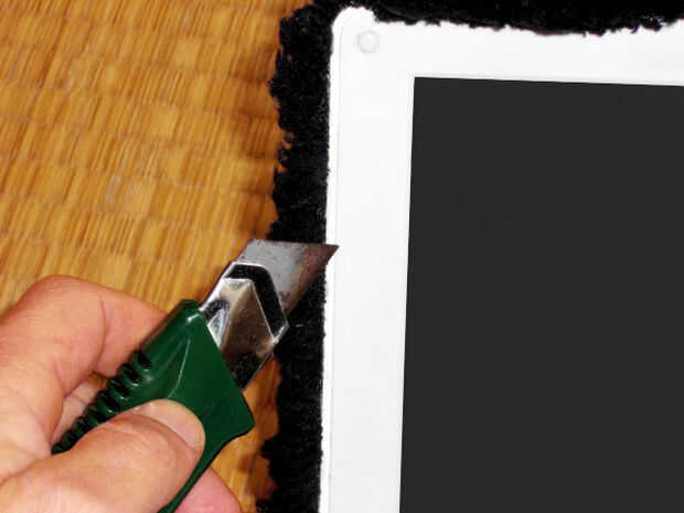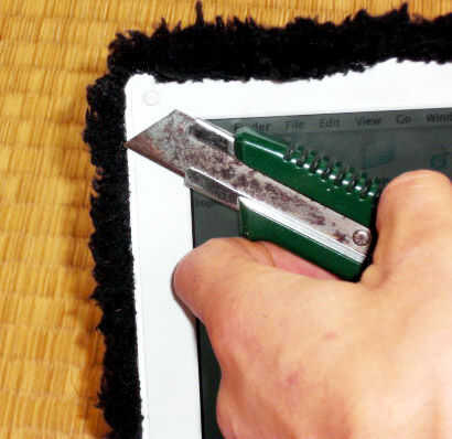 Y no cualquier corte de limpiar desde el exterior con la hoja apuntando hacia la pantalla (cuidado ahora). Esto es donde sería recortar cualquier manchas de pegamento caliente que trascendieron cuando se presiona la piel hacia abajo sobre el pegamento.