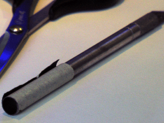 La pluma es un modelo de pasaporte de 1951 Retro marca, no hay venta en línea se ha encontrado para este modelo en particular. Usar cualquier pluma de chequera pequeño con una forma cilíndrica, a planificar para la colocación de vainas en la cubierta del libro. Aquí está un tubo hecho de la cinta de lámparas, se trata de una pieza de prueba para ver si el lápiz se ajusta cómodamente. Pluma de lo que se elige para este mod se convertirá en el único tipo de lápiz para caber.