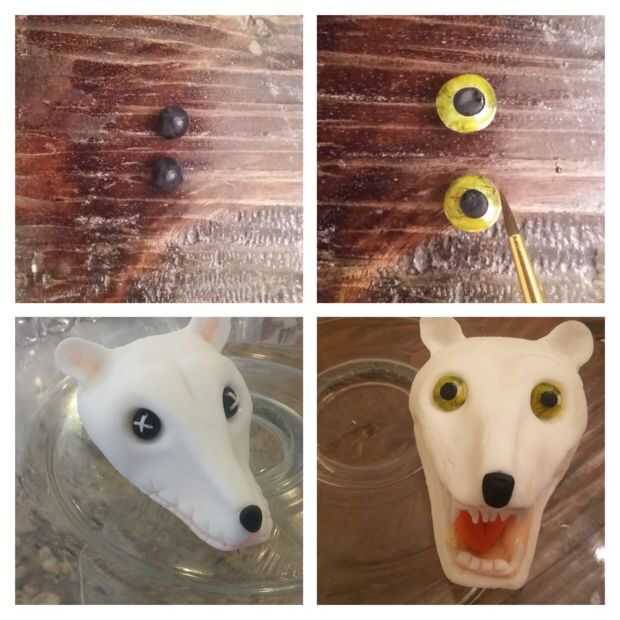 Para los ojos, negro con blanco X'es para la cabeza muerta y el verde y amarillo para el vivo. Sólo colocarlos suavemente en las tomas, con un poco de agua para la adherencia.