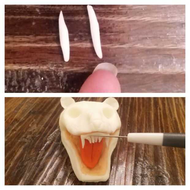 Para los dientes, rollo de líneas fina de fondant, utilice su cuchillo del Exacto, cortar los dientes de puntos, luego pegarlos en la boca con agua y un pincel.