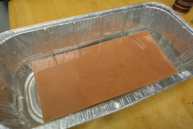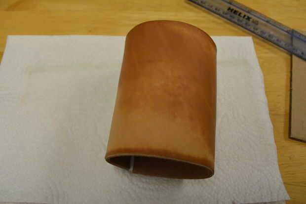 A continuación necesitarás un recipiente lleno de caliente pero no hirviendo agua. Coloque el cuero en el recipiente de agua caliente y asegúrese de que esté completamente sumergido durante unos 10-15 segundos, después tirar de ella.