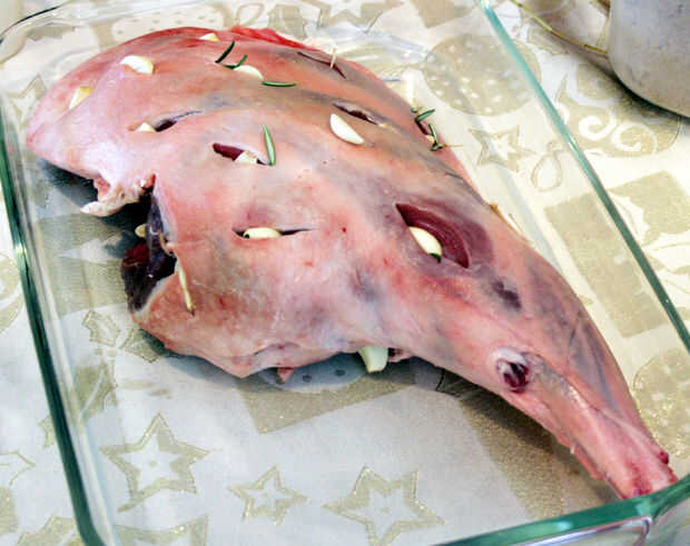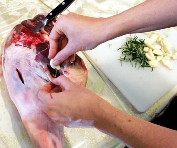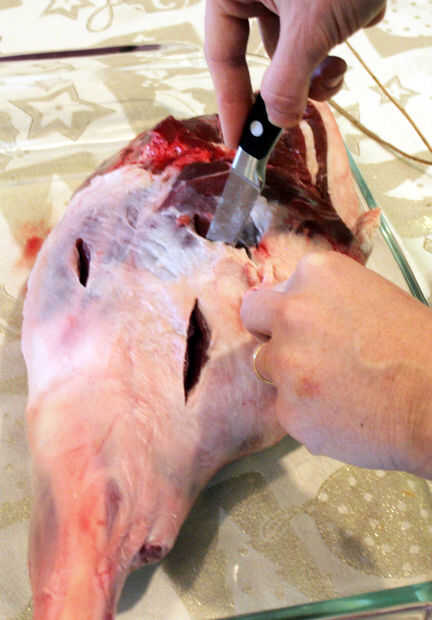 -El corte de aberturas profundas en toda la superficie del cordero, con su cuchillo de cocina.