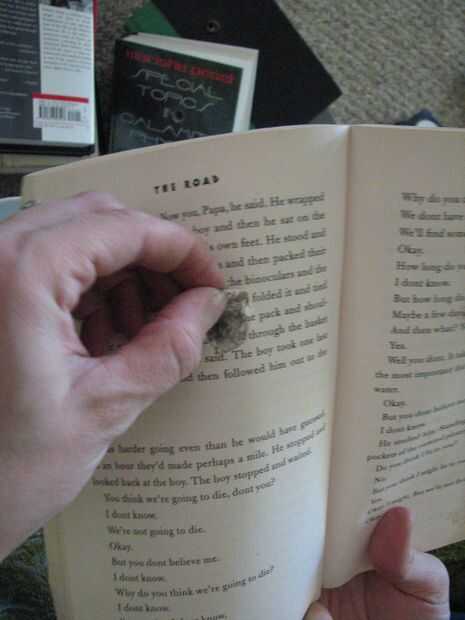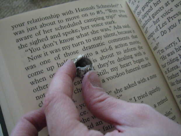 Una vez que había perforado el primer agujero, pasé algún tiempo limpiar la basura que había trabajado su camino entre las páginas del libro. No pasó mucho tiempo, pero fue bien vale la pena el esfuerzo cuando llegó a perforar el segundo orificio, porque nos podríamos sostener mejor los libros cuando Taladre orificio #2. Algunas de las páginas fueron rasgadas levemente, por lo que nos quitó los así.