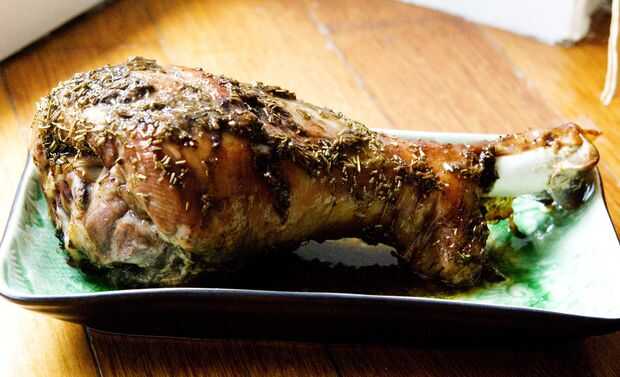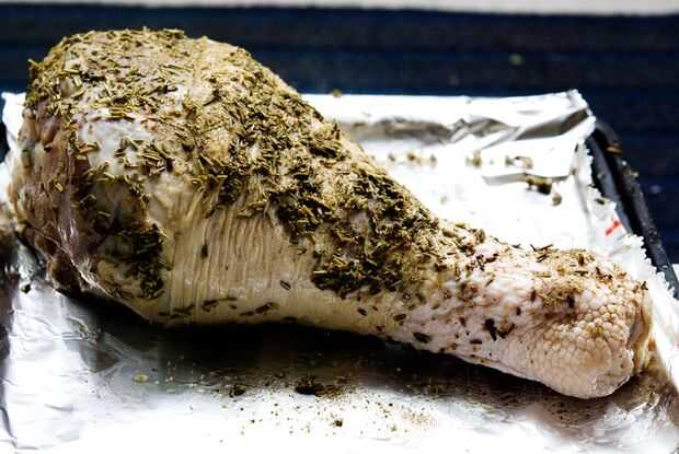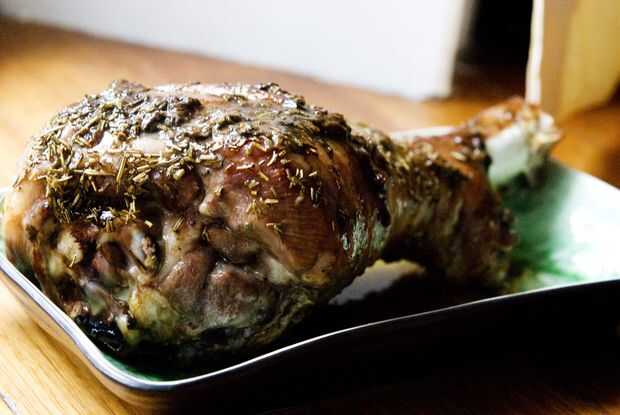 Tomar la pierna de pavo y rehogar durante la noche en vino blanco, dientes de ajo picado 2 y Romero.