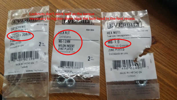 Tenga en cuenta que he comprado algunas tuercas de fijación M6 para probar, pero el esfuerzo de torsión necesario para apretar los hace para deslizarse en el zócalo del pie de goma. Usted puede ensuciar con esto si quieres, pero sólo fui con tuercas hexagonales regulares y utiliza algunos loctite.