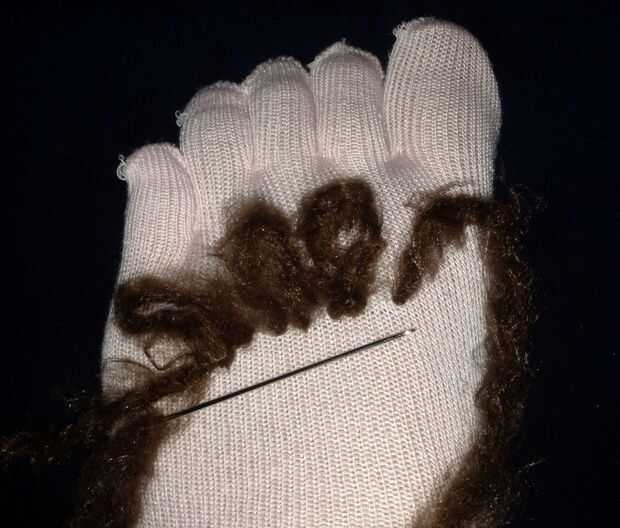 Poner la aguja a través de un pequeño poco de calcetín (tenga cuidado de no meter el pie!) y tire de ella a través, dejando aproximadamente 1" de la cola sobresale al final. Enganche el otro extremo para que coincida con y hacer un nudo rápido.