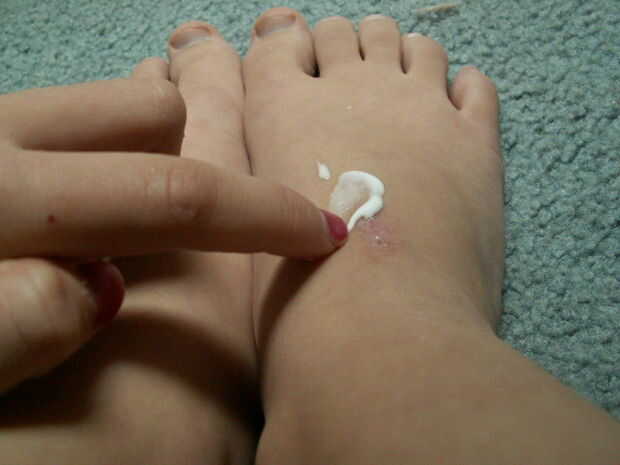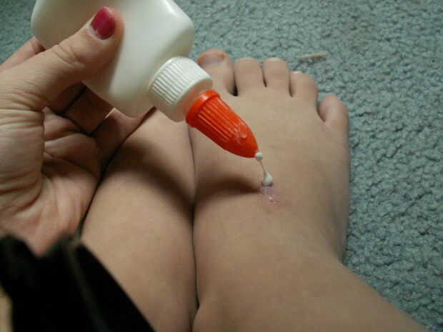 Sacar el pegamento. Squirt de tres y cinco pequeñas gotas de pegamento en el pie. (Agregar más si tienes pies grandes). Extender el pegamento en la parte superior del pie y un poco sobre los dedos del pie.