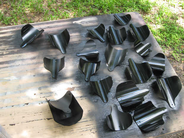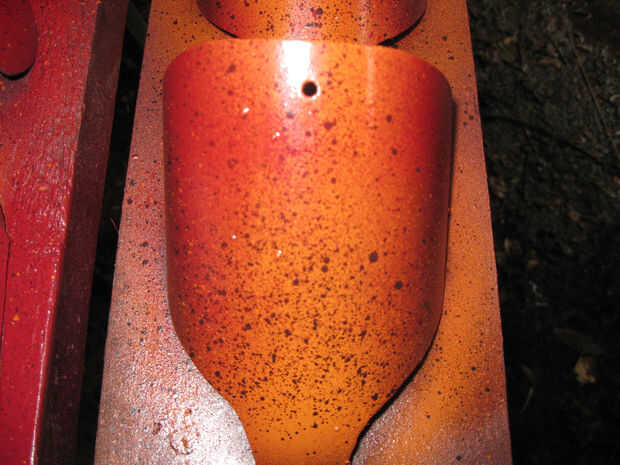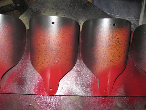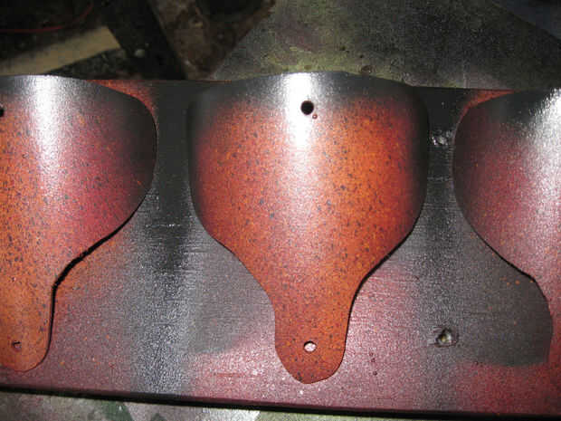 He volteado el cuerpo segmentos derecho hacia arriba y les dio una ligera capa de color negro. Luego di una capa ligera de la abajo rojo oscuro la mitad de los segmentos del cuerpo seguida de un poco de canela en el centro. Me dejó la seco un poco y luego volvió con otra fina capa de negro, rojo y canela. He seguido este con un poco de salpicaduras en negro y canela. Dejó este seco destacó los bordes con negro y rojo en el 'quid' ha añadido.