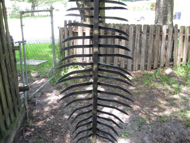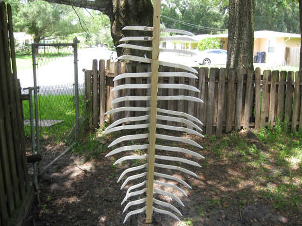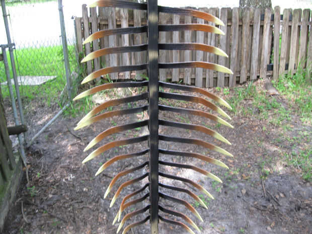 He colgado el tablero con las patas en un trozo de alambre y había pintado negro. He añadido canela a medio camino hacia abajo y destacó las puntas con amarillo. Permita que este seco y 'sucia' todo hasta con niebla y salpicaduras en negro.