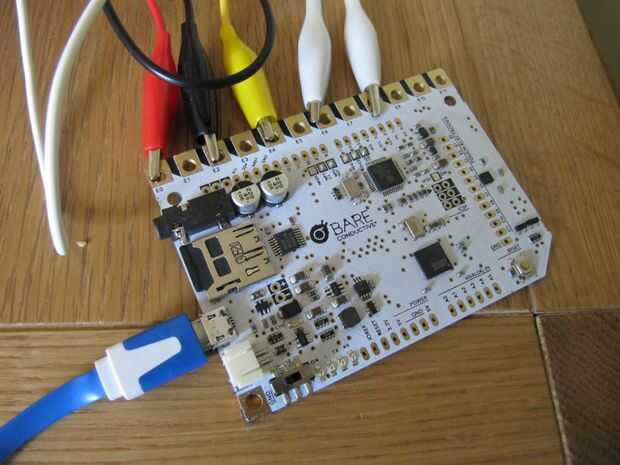 Pinzas cocodrilo conectan los electrodos en el tablero táctil a los pies para activar una línea diferente de la canción. Tocando la empanada, la corteza y llenado de fruto es conductora y hace una conexión eléctrica.