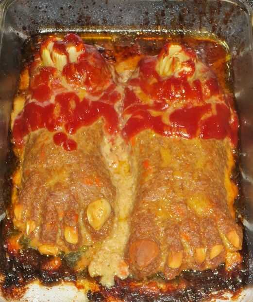 Unos estratégicamente colocados dientes de ajo, verduras y salsa de tomate sobre la carne moldeada como pies y te están corriendo!